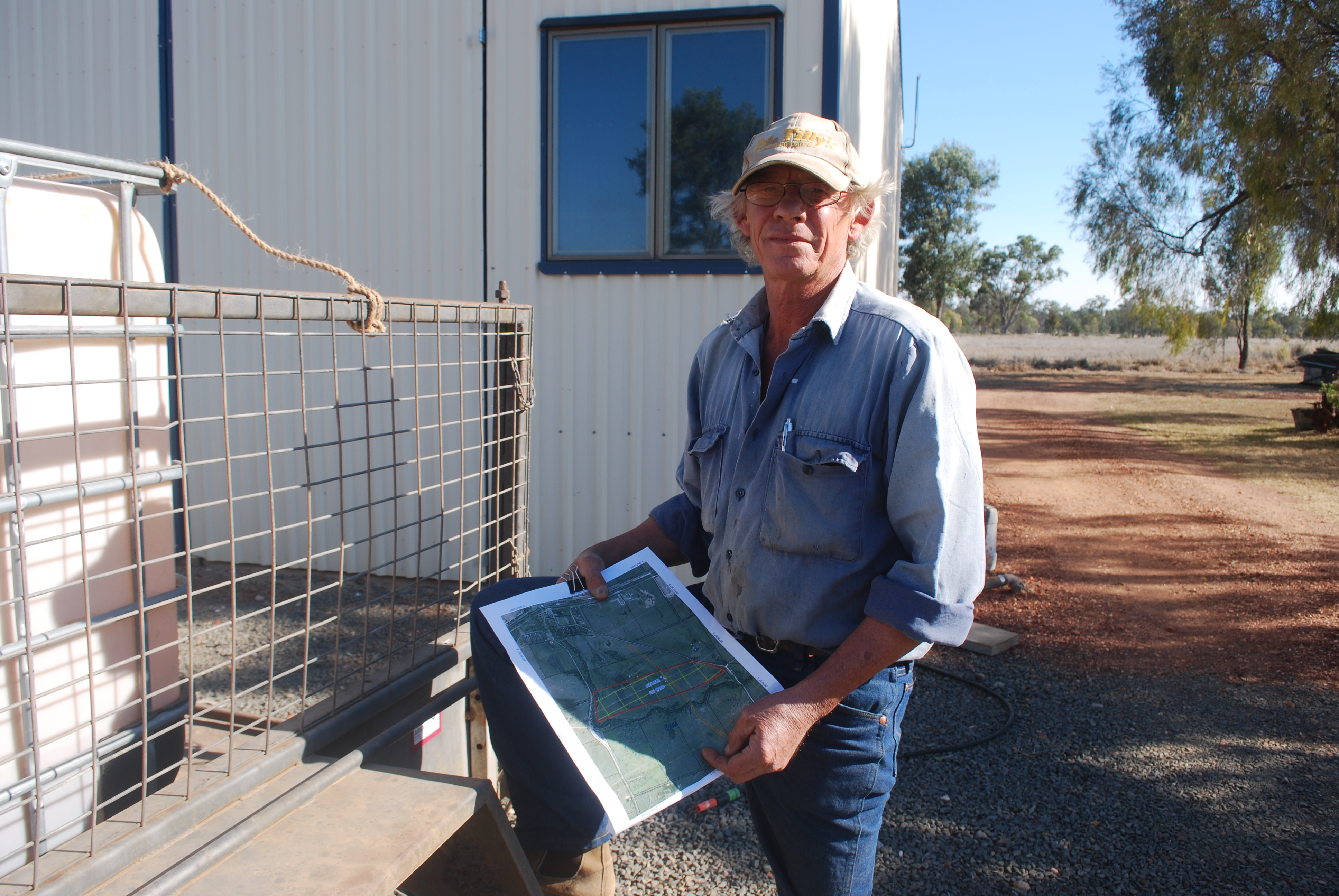 Cooladdi owner Wayne Melby is worried about a Santos map that shows 5km of seismic line going through his house, shed and dams on the 52-hectare property.