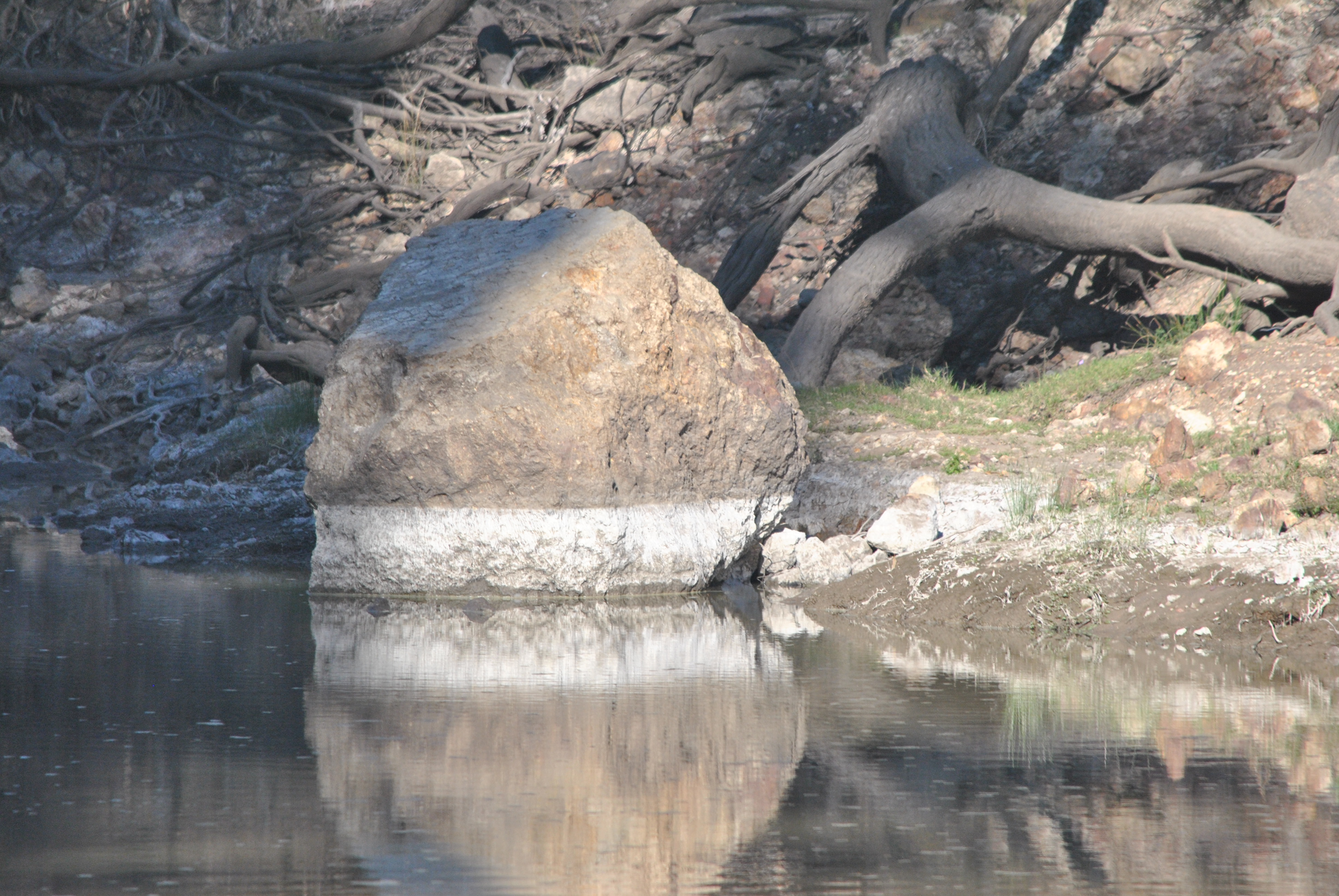 "As the river level dropped, it looks like there's been a contamination of some sort, and a white residue has been left behind from the high water mark, a foot above the water now."
